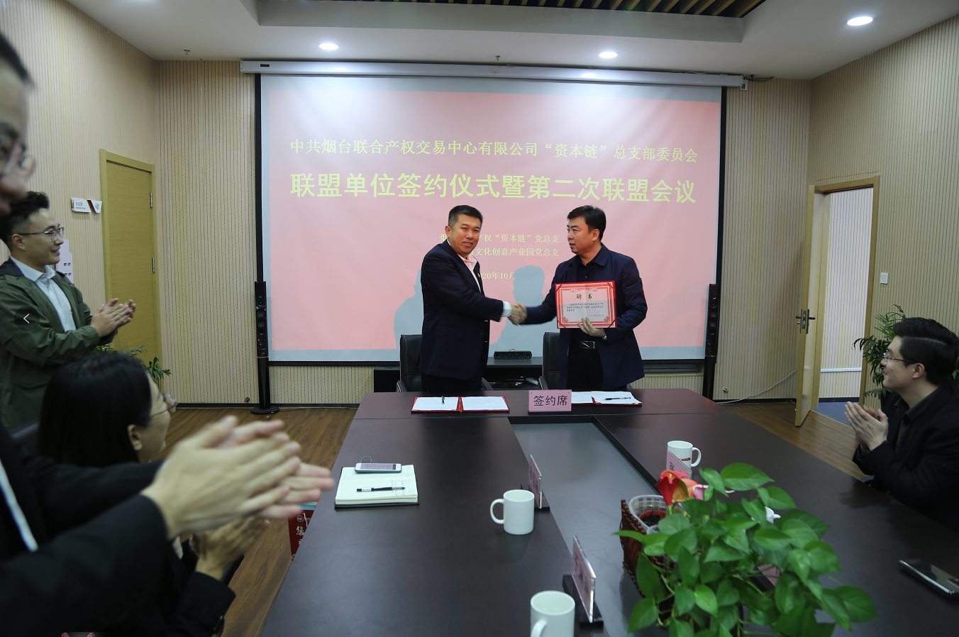 “黨是最好的信仰,建是最大的優(yōu)勢”,懸掛著的各具特色的黨建標(biāo)語,成為了煙臺1861文化創(chuàng)意產(chǎn)業(yè)園黨建文化的最好詮釋。2020年10月29日,迎著晨曦踏著朝陽,聯(lián)合產(chǎn)權(quán)“資本鏈黨總支”會同聯(lián)盟單位煙臺萊山建行黨總支共同來到1861產(chǎn)業(yè)園召開聯(lián)盟單位簽約儀式暨第二次聯(lián)盟會議。簽約儀式上,聯(lián)合產(chǎn)權(quán)黨支部書記初志杰代表“資本鏈黨總支”同1861文化創(chuàng)意產(chǎn)業(yè)園黨總支簽訂聯(lián)盟協(xié)議,并為園區(qū)黨總支書記張儉凱同志頒發(fā)了兼職委員聘書。