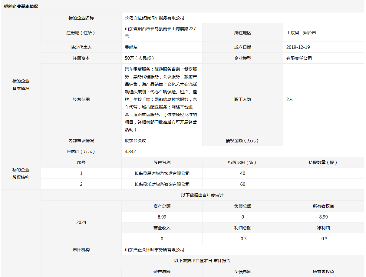 長島百達旅游汽車服務有限公司40%國有股權