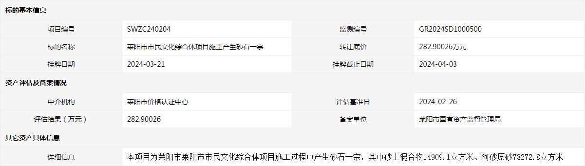 萊陽(yáng)市市民文化綜合體項(xiàng)目施工產(chǎn)生砂石一宗