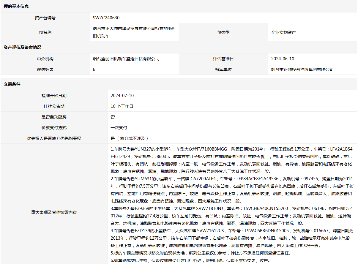 煙臺(tái)市正大城市建設(shè)發(fā)展有限公司持有的4輛舊機(jī)動(dòng)車(chē)