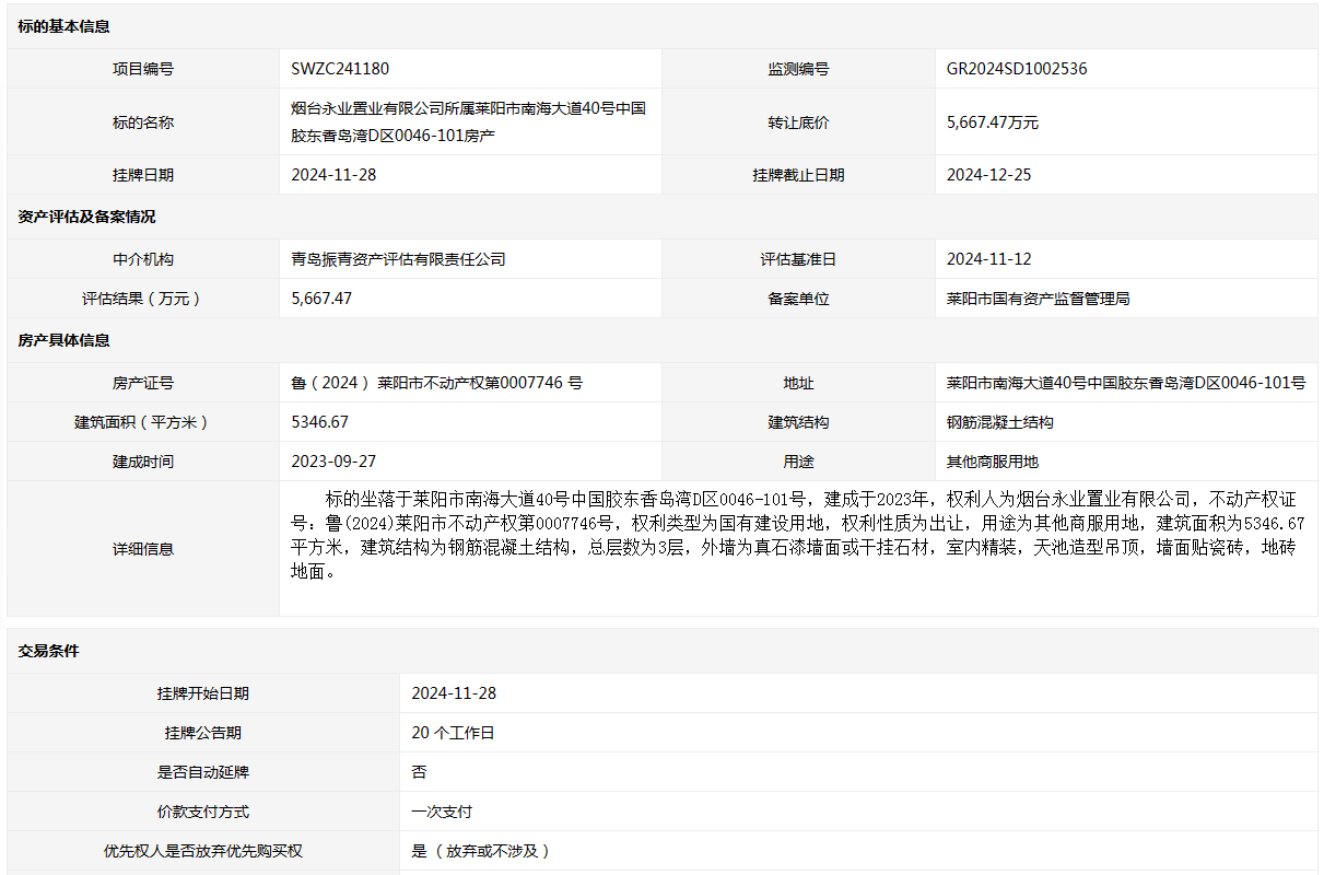 煙臺永業(yè)置業(yè)有限公司所屬萊陽市南海大道40號中國膠東香島灣D區(qū)0046-101房產(chǎn)