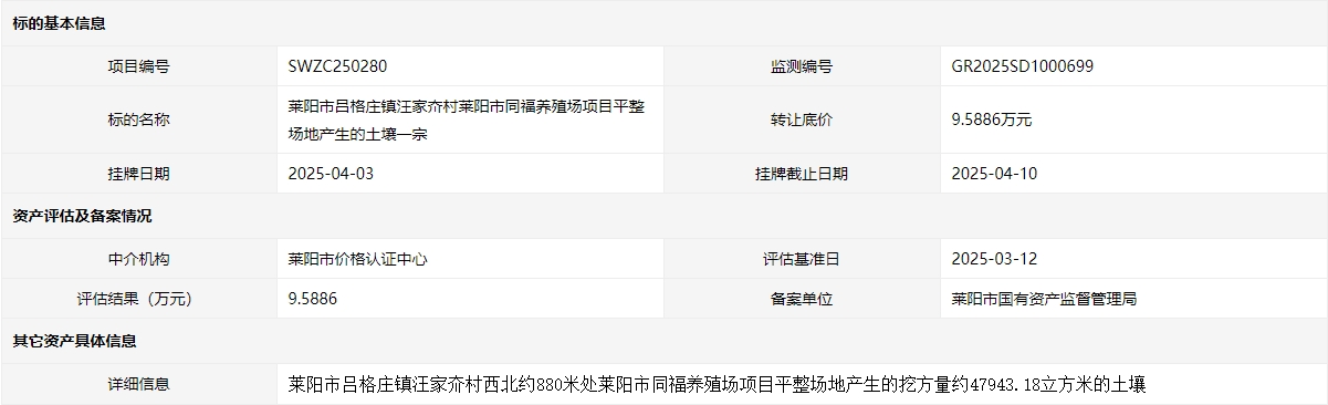 萊陽市呂格莊鎮(zhèn)汪家夼村萊陽市同福養(yǎng)殖場項目平整場地產(chǎn)生的土壤一宗