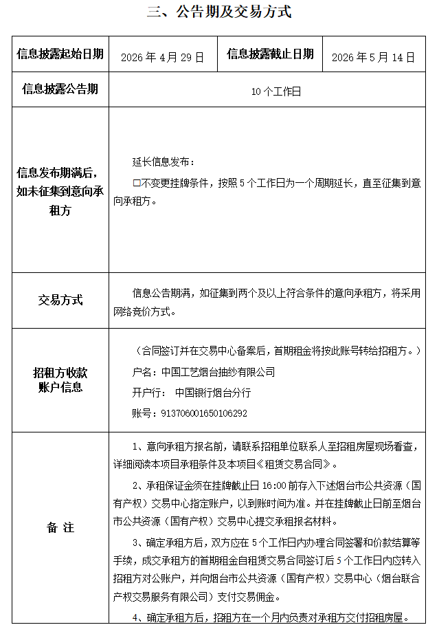 掛牌起止日期:2026年4月29日-2026年5月14日