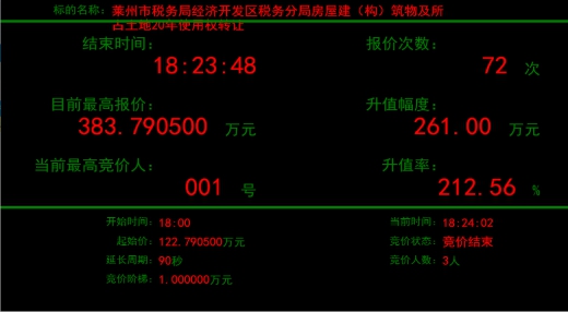 近日,萊州市稅務(wù)局經(jīng)濟(jì)開發(fā)區(qū)稅務(wù)分局所屬房屋建筑物及所占土地20年使用權(quán)轉(zhuǎn)讓項(xiàng)目在煙臺(tái)產(chǎn)權(quán)掛牌并有多個(gè)意向受讓方報(bào)名,最終,經(jīng)過72輪激烈報(bào)價(jià),項(xiàng)目較掛牌底價(jià)122萬元,增值261萬元,增值率高達(dá)212.56%,不但保證了疫情期間國有產(chǎn)權(quán)業(yè)務(wù)的正常開展,而且?guī)椭a(chǎn)權(quán)持有人實(shí)現(xiàn)了價(jià)值最大化。